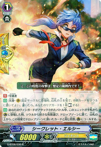 【永】:守護者【自】:天啓-(V)(指定サークルに登場時、山札の上を見て、そのカードをソウルに置いてよい。置いたら、あなたのリアガードを1枚【レスト】する)【自】:あなたのヴァンガードがアタックされたバトル中、このユニットが手札から(G)に登場した時、ソウルから好きな枚数選び、ドロップゾーンに置く。山札の上から、この効果でドロップゾーンに置いたカードと同じ枚数、(G)にコールする。