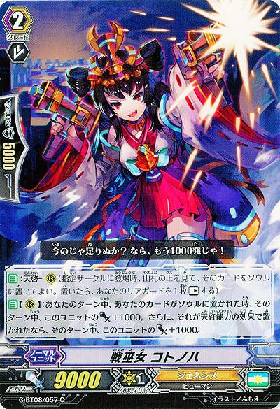 【自】:天啓-(R)(指定サークルに登場時、山札の上を見て、そのカードをソウルに置いてよい。置いたら、あなたのリアガードを1枚【レスト】する)【自】【(R)】:あなたのターン中、あなたのカードがソウルに置かれた時、そのターン中、このユニットのパワー+1000。さらに、それが天啓能力の効果で置かれたなら、そのターン中、このユニットのパワー+1000。