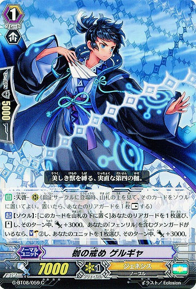 【自】:天啓-(R)(指定サークルに登場時、山札の上を見て、そのカードをソウルに置いてよい。置いたら、あなたのリアガードを1枚【レスト】する)【起】【ソウル】:[このカードを山札の下に置く]あなたのリアガードを1枚選び、【スタンド】し、そのターン中、パワー+3000。あなたの「フェンリル」を含むヴァンガードがいるなら、【ソウルチャージ】(2)し、あなたのユニットを1枚選び、そのターン中、パワー+3000。