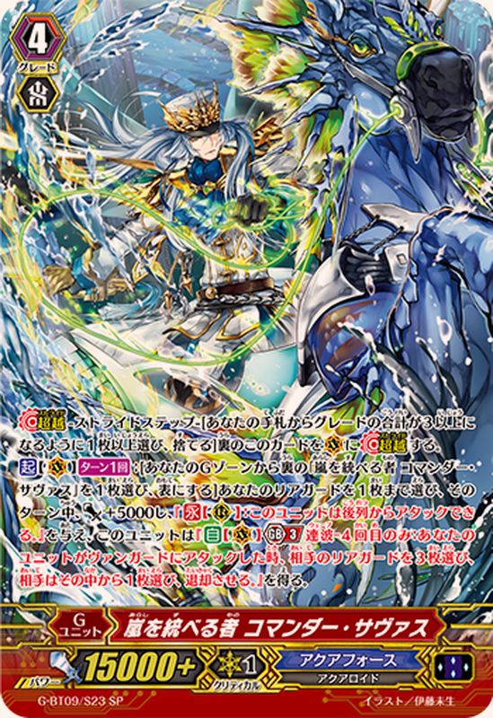 【超越】-ストライドステップ-[あなたの手札からグレードの合計が3以上になるように1枚以上選び、捨てる]裏のこのカードを(V)に【超越】する。【起】【(V)】【ターン1回】:[あなたのGゾーンから裏の「嵐を統べる者 コマンダー・サヴァス」を1枚選び、表にする]あなたのリアガードを1枚まで選び、そのターン中、パワー+5000し、『【永】【(R)】:このユニットは後列からアタックできる。』を与え、このユニットは『【自】【(V)】【Gブレイク】(3)連波-4回目のみ:あなたのユニットがヴァンガードにアタックした時、相手のリアガードを3枚選び、相手はその中から1枚選び、退却させる。』を得る。