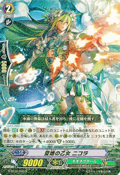 開花-【自】【(R)/(G)】【Gブレイク】(1):このユニットと同名の他のあなたのユニットが、(R)か(G)に登場した時、あなたの、(R)か(G)の「愛嬌の乙女 ニコラ」を2枚まで選び、そのターン中、パワー+4000/シールド+5000。