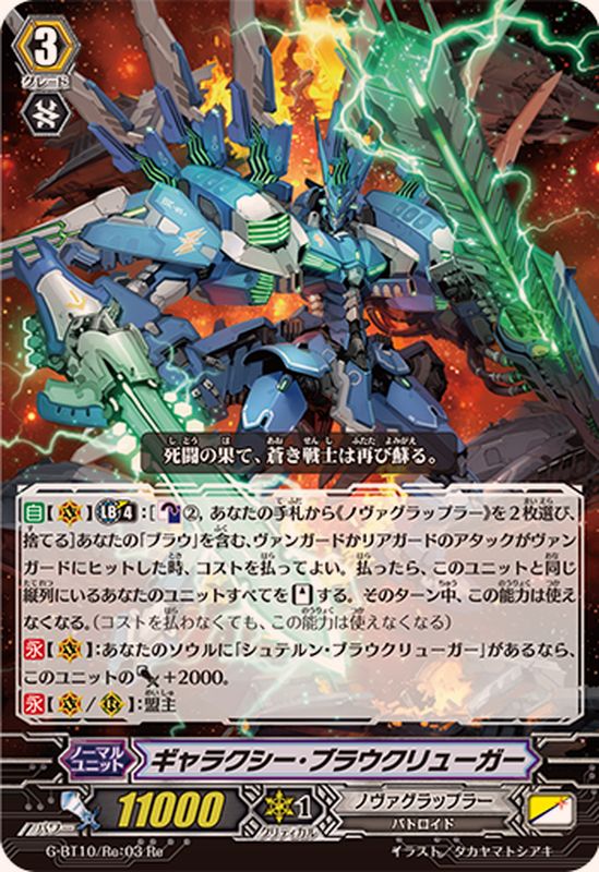 【自】【(V)】【リミットブレイク】(4):[【カウンターブラスト】(2),あなたの手札から《ノヴァグラップラー》を2枚選び、捨てる]あなたの「ブラウ」を含む、ヴァンガードかリアガードのアタックがヴァンガードにヒットした時、コストを払ってよい。払ったら、このユニットと同じ縦列にいるあなたのユニットすべてを【スタンド】する。そのターン中、この能力は使えなくなる。(コストを払わなくても、この能力は使えなくなる)【永】【(V)】:あなたのソウルに「シュテルン・ブラウクリューガー」があるなら、このユニットのパワー+2000。【永】【(V)/(R)】:盟主