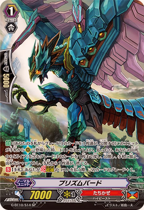 【自】:[あなたの手札からグレード3のカードを1枚選び、公開する]このユニットが手札から(R)に登場した時、コストを払ってよい。払ったら、あなたの山札から「ガイア」を含むグレード3のカードを1枚まで探し、公開し、手札に加え、山札をシャッフルし、手札から1枚選び、捨てる。【永】【手札】:あなたが【超越】のコストを払う際、このカードのグレード+2。