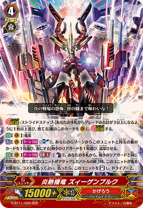 【超越】-ストライドステップ-[あなたの手札からグレードの合計が3以上になるように1枚以上選び、捨てる]裏のこのカードを(V)に【超越】する。【自】【(V)】:竜炎【起】【(V)】【ターン1回】:[【ソウルブラスト】(1),あなたのGゾーンからこのユニットと同名の裏のカードを1枚選び、表にする]相手のリアガードを1枚選び、退却させる。【自】【(V)】【ターン1回】【Gブレイク】(3):[【カウンターブラスト】(1),あなたの手札から、相手のリアガードと同じ枚数選び、捨てる]このユニットがアタックしたバトルの終了時、このユニットが竜炎状態なら、コストを払ってよい。払ったら、このユニットを【スタンド】し、ドライブ-2。
