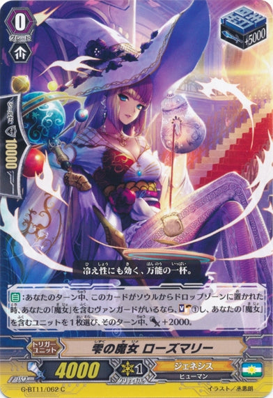 【自】:あなたのターン中、このカードがソウルからドロップゾーンに置かれた時、あなたの「魔女」を含むヴァンガードがいるなら、【ソウルチャージ】(1)し、あなたの「魔女」を含むユニットを1枚選び、そのターン中、パワー+2000。