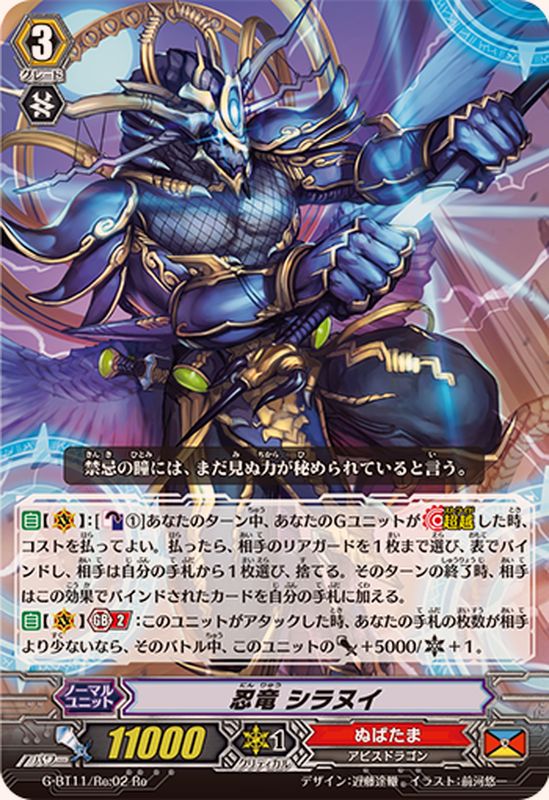 【自】【(V)】:[【カウンターブラスト】(1)]あなたのターン中、あなたのGユニットが【超越】した時、コストを払ってよい。払ったら、相手のリアガードを1枚まで選び、表でバインドし、相手は自分の手札から1枚選び、捨てる。そのターンの終了時、相手はこの効果でバインドされたカードを自分の手札に加える。【自】【(V)】【Gブレイク】(2):このユニットがアタックした時、あなたの手札の枚数が相手より少ないなら、そのバトル中、このユニットのパワー+5000/クリティカル+1。