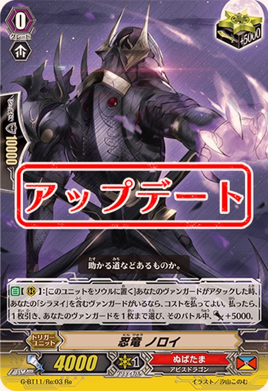 アップデート:シールド、トリガー、テキスト【自】【(R)】:「シラヌイ」を含むグレード3以上のあなたのヴァンガードがアタックした時、【コスト】[このユニットをソウルに置く]ことで、1枚引き、あなたのヴァンガードを1枚選び、そのバトル中、パワー+5000。【自】:このカードがダメージチェックで出た時、1枚引く。