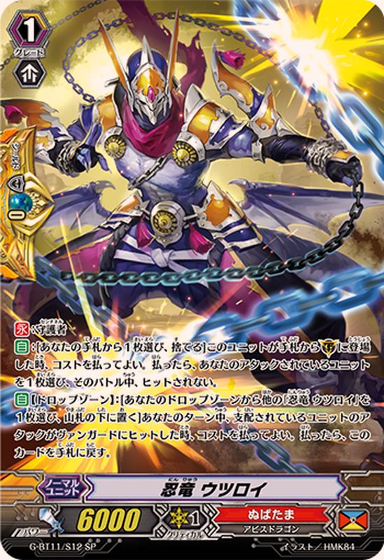 【永】:守護者【自】:[あなたの手札から1枚選び、捨てる]このユニットが手札から(G)に登場した時、コストを払ってよい。払ったら、あなたのアタックされているユニットを1枚選び、そのバトル中、ヒットされない。【自】【ドロップゾーン】:[あなたのドロップゾーンから他の「忍竜 ウツロイ」を1枚選び、山札の下に置く]あなたのターン中、支配されているユニットのアタックがヴァンガードにヒットした時、コストを払ってよい。払ったら、このカードを手札に戻す。