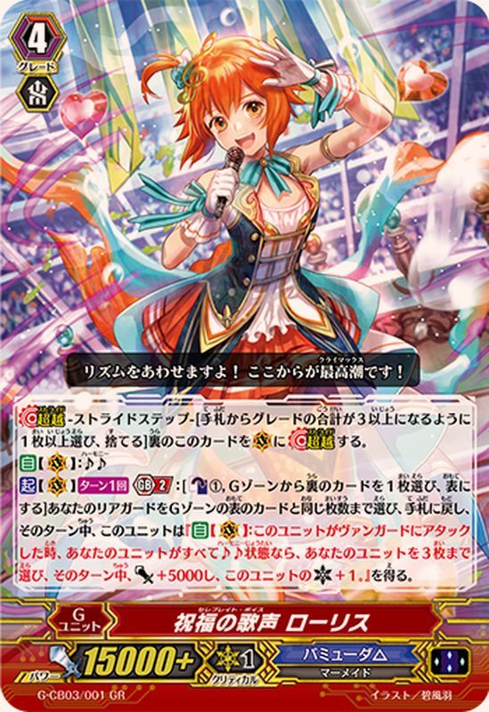 【超越】-ストライドステップ-[手札からグレードの合計が3以上になるように1枚以上選び、捨てる]裏のこのカードを(V)に【超越】する。【自】【(V)】:♪♪【起】【(V)】【ターン1回】【Gブレイク】(2):[【カウンターブラスト】(1),Gゾーンから裏のカードを1枚選び、表にする]あなたのリアガードをGゾーンの表のカードと同じ枚数まで選び、手札に戻し、そのターン中、このユニットは『【自】【(V)】:このユニットがヴァンガードにアタックした時、あなたのユニットがすべて♪♪状態なら、あなたのユニットを3枚まで選び、そのターン中、パワー+5000し、このユニットのクリティカル+1。』を得る。