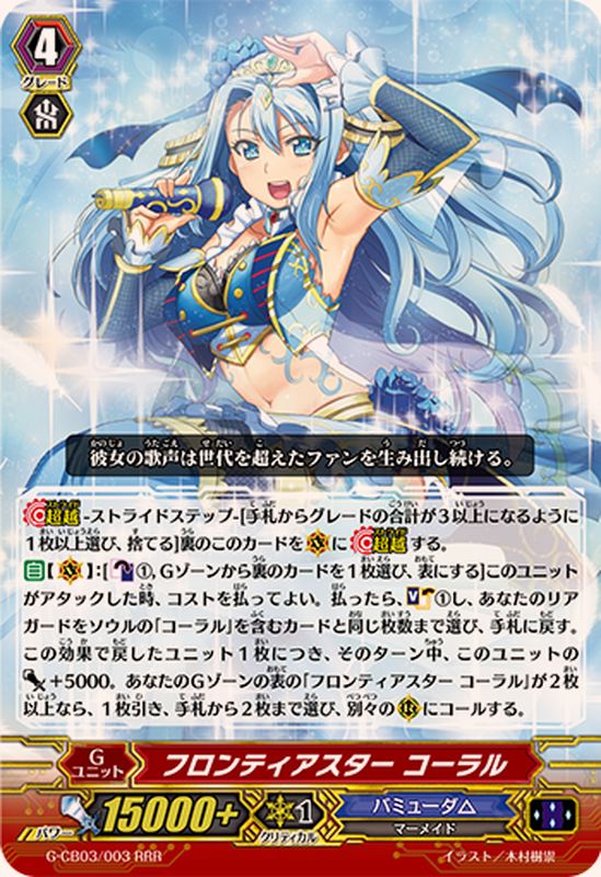 【超越】-ストライドステップ-[手札からグレードの合計が3以上になるように1枚以上選び、捨てる]裏のこのカードを(V)に【超越】する。【自】【(V)】:[【カウンターブラスト】(1),Gゾーンから裏のカードを1枚選び、表にする]このユニットがアタックした時、コストを払ってよい。払ったら、【ソウルチャージ】(1)し、あなたのリアガードをソウルの「コーラル」を含むカードと同じ枚数まで選び、手札に戻す。この効果で戻したユニット1枚につき、そのターン中、このユニットのパワー+5000。あなたのGゾーンの表の「フロンティアスター コーラル」が2枚以上なら、1枚引き、手札から2枚まで選び、別々の(R)にコールする。