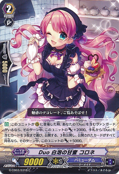 【自】:このユニットが(R)に登場した時、あなたの「Duo」を含むヴァンガードがいるなら、そのターン中、このユニットのパワー+2000。手札から「Duo」を含むカードを3枚まで選び、公開する。3枚公開し、公開されたカードがすべて同名なら、そのターン中、このユニットのパワー+5000。
