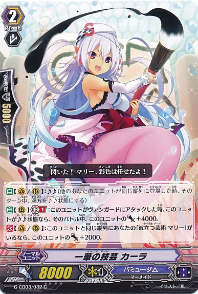 【自】【(V)/(R)】:♪♪(他のあなたのユニットが同じ縦列に登場した時、そのターン中、双方を♪♪状態にする)【自】【(R)】【Gブレイク】(1):このユニットがヴァンガードにアタックした時、このユニットが♪♪状態なら、そのバトル中、このユニットのパワー+4000。【永】【(V)/(R)】:このユニットと同じ縦列にあなたの「波立つ芸術 マリー」がいるなら、このユニットのパワー+2000。