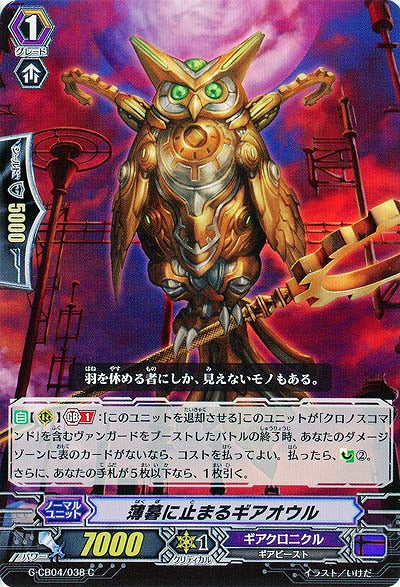 【自】【(R)】【Gブレイク】(1):[このユニットを退却させる]このユニットが「クロノスコマンド」を含むヴァンガードをブーストしたバトルの終了時、あなたのダメージゾーンに表のカードがないなら、コストを払ってよい。払ったら、【カウンターチャージ】(2)。さらに、あなたの手札が5枚以下なら、1枚引く。