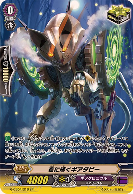 【自】:[このカードをソウルに置く]このユニットが(R)からバインドゾーンに置かれた時、あなたの「クロノファング」を含むヴァンガードがいるなら、コストを払ってよい。払ったら、1枚引き、あなたのヴァンガードを1枚選び、そのターン中、パワー+5000。
