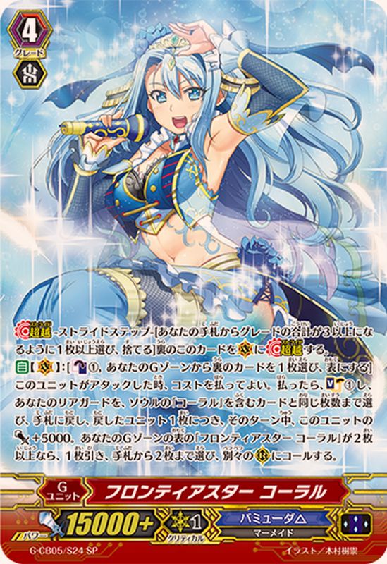 【超越】-ストライドステップ-[あなたの手札からグレードの合計が3以上になるように1枚以上選び、捨てる]裏のこのカードを(V)に【超越】する。【自】【(V)】:[【カウンターブラスト】(1),あなたのGゾーンから裏のカードを1枚選び、表にする]このユニットがアタックした時、コストを払ってよい。払ったら、【ソウルチャージ】(1)し、あなたのリアガードを、ソウルの「コーラル」を含むカードと同じ枚数まで選び、手札に戻し、戻したユニット1枚につき、そのターン中、このユニットのパワー+5000。あなたのGゾーンの表の「フロンティアスター コーラル」が2枚以上なら、1枚引き、手札から2枚まで選び、別々の(R)にコールする。
