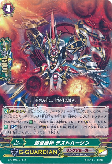 【Gガーディアン】(お互いのヴァンガードがグレード3以上で、あなたのGゾーンに表のGガーディアンが3枚以下なら使える)-相手ターンのガードステップ-[あなたの手札から【治】を1枚選び、捨てる]裏のこのカードを(G)にコールする。【自】:[【ソウルブラスト】(1)]このユニットが(G)に登場した時、呪縛カードが2枚以上なら、コストを払ってよい。払ったら、1枚引く。