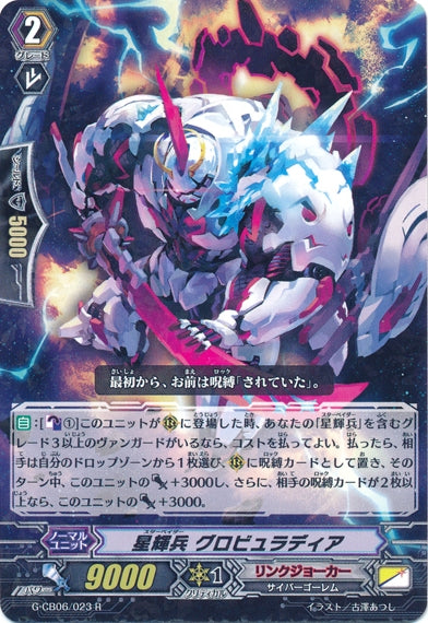 【自】:[【カウンターブラスト】(1)]このユニットが(R)に登場した時、あなたの「星輝兵」を含むグレード3以上のヴァンガードがいるなら、コストを払ってよい。払ったら、相手は自分のドロップゾーンから1枚選び、(R)に呪縛カードとして置き、そのターン中、このユニットのパワー+3000し、さらに、相手の呪縛カードが2枚以上なら、このユニットのパワー+3000。