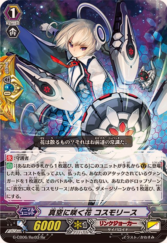 【永】:守護者【自】:[あなたの手札から1枚選び、捨てる]このユニットが手札から(G)に登場した時、コストを払ってよい。払ったら、あなたのアタックされているヴァンガードを1枚選び、そのバトル中、ヒットされない。あなたのドロップゾーンに「真空に咲く花 コスモリース」があるなら、ダメージゾーンから1枚選び、表にする。