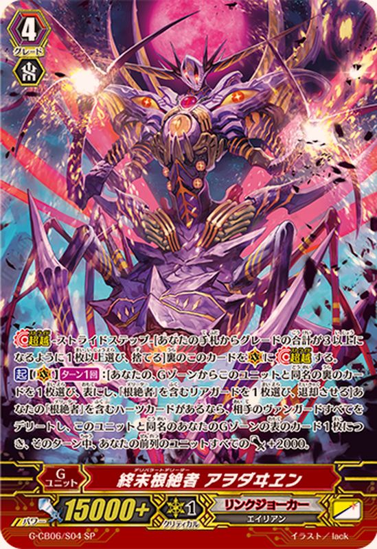 【超越】-ストライドステップ-[あなたの手札からグレードの合計が3以上になるように1枚以上選び、捨てる]裏のこのカードを(V)に【超越】する。【起】【(V)】【ターン1回】:[あなたの、Gゾーンからこのユニットと同名の裏のカードを1枚選び、表にし、「根絶者」を含むリアガードを1枚選び、退却させる]あなたの「根絶者」を含むハーツカードがあるなら、相手のヴァンガードすべてをデリートし、このユニットと同名のあなたのGゾーンの表のカード1枚につき、そのターン中、あなたの前列のユニットすべてのパワー+2000。