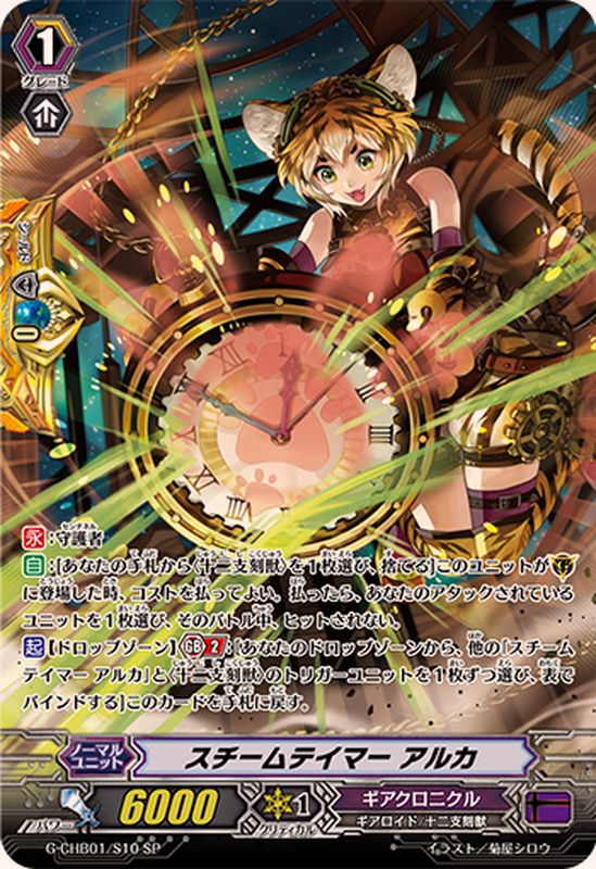 【永】:守護者【自】:[あなたの手札から〈十二支刻獣〉を1枚選び、捨てる]このユニットが(G)に登場した時、コストを払ってよい。払ったら、あなたのアタックされているユニットを1枚選び、そのバトル中、ヒットされない。【起】【ドロップゾーン】【Gブレイク】(2):[あなたのドロップゾーンから、他の「スチームテイマー アルカ」と〈十二支刻獣〉のトリガーユニットを1枚ずつ選び、表でバインドする]このカードを手札に戻す。