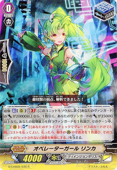 超爆-【起】【(R)】【Gブレイク】(2):[このユニットをソウルに置く]あなたのヴァンガードのパワーが20000以上なら、1枚引く。あなたのヴァンガードのパワーが35000以上なら、あなたの超爆能力を持つヴァンガードを1枚選び、そのターン中、『【自】【(V)】:[【ソウルブラスト】(1)]あなたのドライブチェックでグレード3のカードがでた時、コストを払ってよい。払ったら、相手の(G)の守護者を1枚選び、そのユニットの『ヒットされない』効果を無効にする。』を与える。