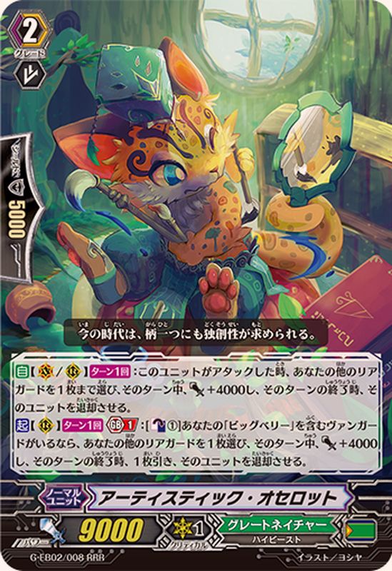 【自】【(V)/(R)】【ターン1回】:このユニットがアタックした時、あなたの他のリアガードを1枚まで選び、そのターン中、パワー+4000し、そのターンの終了時、そのユニットを退却させる。【起】【(R)】【ターン1回】【Gブレイク】(1):[【カウンターブラスト】(1)]あなたの「ビッグベリー」を含むヴァンガードがいるなら、あなたの他のリアガードを1枚選び、そのターン中、パワー+4000し、そのターンの終了時、1枚引き、そのユニットを退却させる。