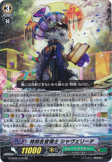 【自】:[あなたの手札からグレードの合計が3以上になるように1枚以上選び、捨てる]このユニットが(V)に登場した時、コストを払ってよい。払ったら、あなたの山札からそれぞれ別名の「特別名誉博士」を含むカードを2枚まで探し、公開し、手札に加え、山札をシャッフルする。【自】【(V)】:[【カウンターブラスト】(1)]あなたの「特別名誉博士」を元々含むGユニットが【超越】した時、コストを払ってよい。払ったら、あなたの山札からグレード3のカードを1枚まで探し、(V)にハーツ状態で置き、山札をシャッフルし、1枚置いたら、このカードを手札に戻す。