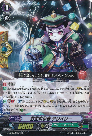 【永】:守護者【自】:[あなたの手札から1枚選び、捨てる]このユニットが手札から(G)に登場した時、コストを払ってよい。払ったら、あなたのユニットを1枚選び、そのバトル中、ヒットされない。【自】【Gブレイク】(1):[【ソウルブラスト】(1)]このユニットが(R)か(G)から退却した時、あなたの「ビッグベリー」を含むヴァンガードがいるなら、コストを払ってよい。払ったら、1枚まで引き、【カウンターチャージ】(1)。