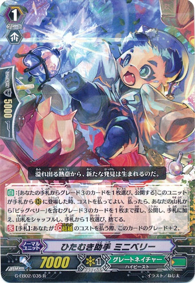 【自】:[あなたの手札からグレード3のカードを1枚選び、公開する]このユニットが手札から(R)に登場した時、コストを払ってよい。払ったら、あなたの山札から「ビッグベリー」を含むグレード3のカードを1枚まで探し、公開し、手札に加え、山札をシャッフルし、手札から1枚選び、捨てる。【永】【手札】:あなたが【超越】のコストを払う際、このカードのグレード+2。