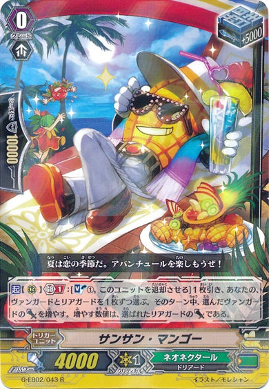 【起】【(R)】【Gブレイク】(1):[【ソウルブラスト】(1),このユニットを退却させる]1枚引き、あなたの、ヴァンガードとリアガードを1枚ずつ選ぶ。そのターン中、選んだヴァンガードのパワーを増やす。増やす数値は、選ばれたリアガードのパワーである。