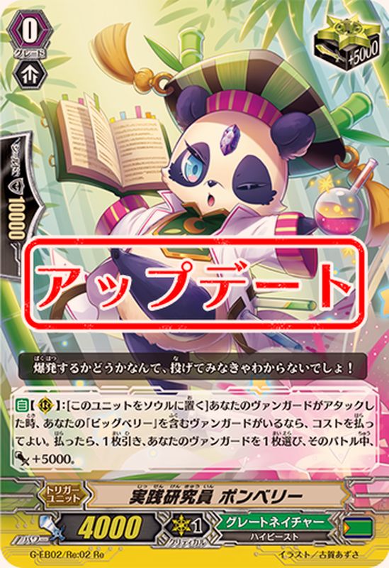 アップデート:シールド、トリガー、テキスト【自】【(R)】:「ビッグベリー」を含むグレード3以上のあなたのヴァンガードがアタックした時、【コスト】[このユニットをソウルに置く]ことで、1枚引き、あなたのヴァンガードを1枚選び、そのバトル中、パワー+5000。【自】:このカードがダメージチェックで出た時、1枚引く。