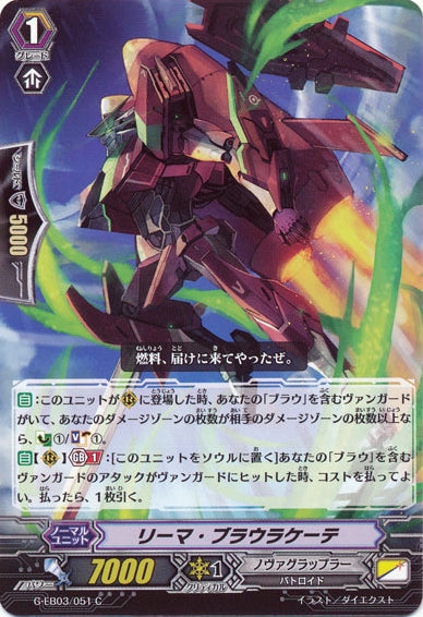 【自】:このユニットが(R)に登場した時、あなたの「ブラウ」を含むヴァンガードがいて、あなたのダメージゾーンの枚数が相手のダメージゾーンの枚数以上なら、【カウンターチャージ】(1)/【ソウルチャージ】(1)。【自】【(R)】【Gブレイク】(1):[このユニットをソウルに置く]あなたの「ブラウ」を含むヴァンガードのアタックがヴァンガードにヒットした時、コストを払ってよい。払ったら、1枚引く。