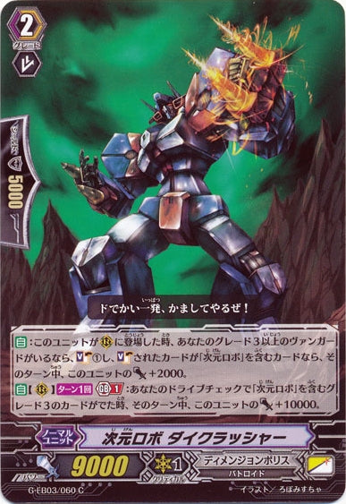 【自】:このユニットが(R)に登場した時、あなたのグレード3以上のヴァンガードがいるなら、【ソウルチャージ】(1)し、【ソウルチャージ】されたカードが「次元ロボ」を含むカードなら、そのターン中、このユニットのパワー+2000。【自】【(R)】【ターン1回】【Gブレイク】(1):あなたのドライブチェックで「次元ロボ」を含むグレード3のカードがでた時、そのターン中、このユニットのパワー+10000。