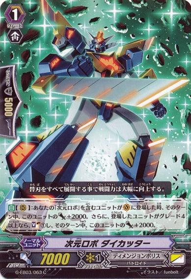 【自】【(R)】:あなたの「次元ロボ」を含むユニットが(V)に登場した時、そのターン中、このユニットのパワー+2000。さらに、登場したユニットがグレード4以上なら、【ソウルチャージ】(1)し、そのターン中、このユニットのパワー+2000。