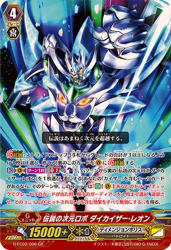 【超越】-ストライドステップ-[手札からグレードの合計が3以上になるように1枚以上選び、捨てる]裏のこのカードを(V)に【超越】する。【起】【(V)】【ターン1回】【Gブレイク】(2):[【カウンターブラスト】(1),Gゾーンから裏の「伝説の次元ロボ ダイカイザー・レオン」を1枚選び、表にする]あなたの「カイザー」を含むハーツカードがあるなら、そのターン中、このユニットは『【自】【(V)】:あなたのドライブチェックでグレード3のカードが出た時、相手のガーディアンを1枚まで選び、退却させ、そのユニットの『ヒットされない』を含む効果をすべて無効にする。』を得る。