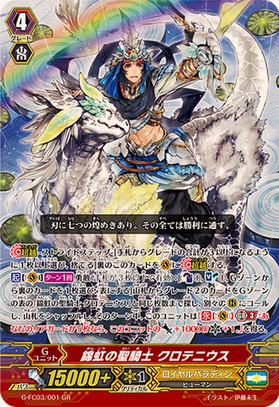 【超越】-ストライドステップ-[手札からグレードの合計が3以上になるように1枚以上選び、捨てる]裏のこのカードを(V)に【超越】する。【起】【(V)】【ターン1回】勇敢(手札が3枚以下で有効):[【カウンターブラスト】(1),【ソウルブラスト】(1),Gゾーンから裏のカードを1枚選び、表にする]山札からグレード2のカードをGゾーンの表の「錦虹の聖騎士 クロテニウス」と同じ枚数まで探し、別々の(R)にコールし、山札をシャッフルし、そのターン中、このユニットは『【永】【(V)】【Gブレイク】(3):あなたのリアガードが5枚なら、このユニットのパワー+10000/クリティカル+1。』を得る。