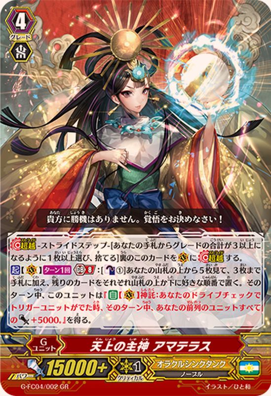 【超越】-ストライドステップ-[あなたの手札からグレードの合計が3以上になるように1枚以上選び、捨てる]裏のこのカードを(V)に【超越】する。【起】【(V)】【ターン1回】【Gブレイク】(8):[【カウンターブラスト】(1)]あなたの山札の上から5枚見て、3枚まで手札に加え、残りのカードをそれぞれ山札の上か下に好きな順番で置く。そのターン中、このユニットは『【自】【(V)】神託:あなたのドライブチェックでトリガーユニットがでた時、そのターン中、あなたの前列のユニットすべてのパワー+5000。』を得る。