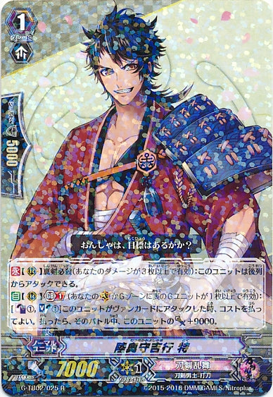 【永】【(R)】真剣必殺(あなたのダメージが3枚以上で有効):このユニットは後列からアタックできる。【自】【(R)】【Gブレイク】(1)(あなたの(V)かGゾーンに表のGユニットが1枚以上で有効):[【カウンターブラスト】(1),【ソウルブラスト】(1)]このユニットがヴァンガードにアタックした時、コストを払ってよい。払ったら、そのバトル中、このユニットのパワー+9000。