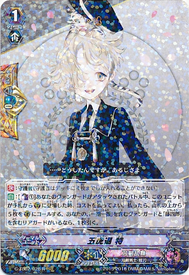 【永】:守護者(守護者はデッキに4枚までしか入れることができない)【自】:[【カウンターブラスト】(1)]あなたのヴァンガードがアタックされたバトル中、このユニットが手札から(G)に登場した時、コストを払ってよい。払ったら、山札の上から5枚を(G)にコールする。あなたの、「一期一振」を含むヴァンガードと「藤四郎」を含むリアガードがいるなら、1枚引く。