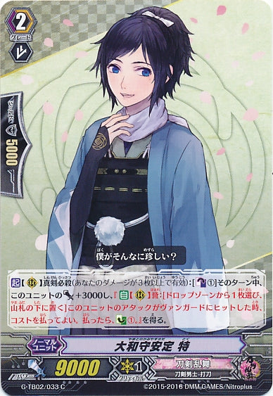 【起】【(R)】真剣必殺(あなたのダメージが3枚以上で有効):[【カウンターブラスト】(1)]そのターン中、このユニットのパワー+3000し、『【自】【(R)】誉:[ドロップゾーンから1枚選び、山札の下に置く]このユニットのアタックがヴァンガードにヒットした時、コストを払ってよい。払ったら、【カウンターチャージ】(1)。』を得る。