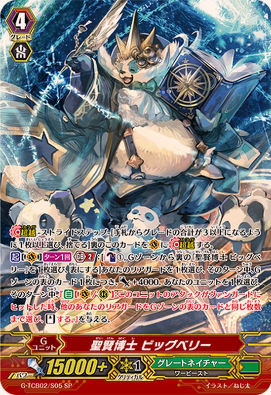 【超越】-ストライドステップ-[手札からグレードの合計が3以上になるように1枚以上選び、捨てる]裏のこのカードを(V)に【超越】する。【起】【(V)】【ターン1回】【Gブレイク】(2):[【カウンターブラスト】(1),Gゾーンから裏の「聖賢博士 ビッグベリー」を1枚選び、表にする]あなたのリアガードを1枚選び、そのターン中、Gゾーンの表のカード1枚につき、パワー+4000。あなたのユニットを1枚選び、そのターン中、『【自】【(V)/(R)】:このユニットのアタックがヴァンガードにヒットした時、他のあなたのリアガードをGゾーンの表のカードと同じ枚数まで選び、【スタンド】する。』を与える。