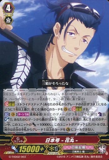 (Gユニットはメインデッキに入れられない。お互いがグレード3以上なら超越でき、ハーツのパワーとカード名を得て、ターン終了時に表で戻る)【超越】-ストライドステップ-[あなたの手札からグレードの合計が3以上になるように1枚以上選び、捨てる]裏のこのカードを(V)に【超越】する。【起】【(V)】【ターン1回】真剣必殺(あなたのダメージが3枚以上で有効):[【カウンターブラスト】(1),【ソウルブラスト】(1),あなたのGゾーンから裏の「日本号 -花丸-」を1枚選び、表にする]そのターン中、このユニットのパワー+10000し、このユニットがアタックしたバトルでは、相手は自分の手札からグレード1以上のカードを(G)にコールできない。