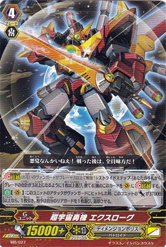 アップデート:テキスト【超越】-ストライドステップ-【コスト】[手札からグレードの合計が3以上になるように1枚以上選び、捨てる]ことで、裏のこのカードを(V)に【超越】する。【起】【Gゾーン】:あなたのヴァンガードがグレード3の「大宇宙勇機 グランギャロップ」で、このファイトであなたがイマジナリーギフトを得ていないなら、【コスト】[手札からグレードの合計が3以上になるように1枚以上選び、捨てる]ことで、裏のこのカードを(V)に【超越】する。さらに【コスト】[Gゾーンからこのユニットと同名を1枚表にする]ことで、イマジナリーギフト・フォースを2つ得る。【永】【(V)】:あなたは、このユニットの『ヒットした時』の効果を、ヒットしていなくても発動する。【自】【(V)】:このユニットのアタックがヴァンガードにヒットした時、このユニットがパワー37000以上なら、1枚引き、相手は自分のリアガードを1枚選び、 退却させる。