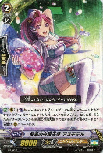 【自】【(R)】:[【カウンターブラスト】(1),このユニットをダメージゾーンに置く]このユニットのアタックがヴァンガードにヒットした時、コストを払ってよい。払ったら、あなたのダメージゾーンから「投薬の守護天使 アスモデル」以外の表のカードを1枚選び、(R)にコールする。