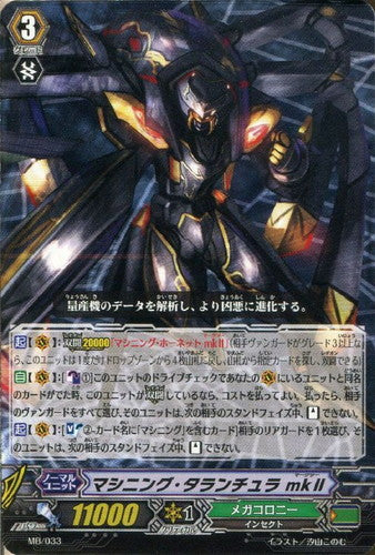 【起】【(V)】:【双闘20000】「マシニング・ホーネット mkⅡ」(相手ヴァンガードがグレード3以上なら、このユニットは1度だけドロップゾーンから4枚山札に戻し、山札から指定カードを探し、双闘できる)【自】【(V)】:[【カウンターブラスト】(1)]このユニットのドライブチェックであなたの(V)にいるユニットと同名のカードがでた時、このユニットが【双闘】しているなら、コストを払ってよい。払ったら、相手のヴァンガードをすべて選び、そのユニットは、次の相手のスタンドフェイズ中、【スタンド】できない。【起】【(V)】:[【ソウルブラスト】(2)-カード名に「マシニング」を含むカード]相手のリアガードを1枚選び、そのユニットは、次の相手のスタンドフェイズ中、【スタンド】できない。