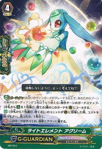 【Gガーディアン】(お互いのヴァンガードがグレード3以上で、あなたのGゾーンの表のGガーディアンが3枚以下なら使える)-相手ターンのガードステップ-[手札から【治】を1枚選び、捨てる]裏のこのカードを(G)に【レスト】でコールする。【自】:[手札から1枚選び、捨てる]このユニットが(G)に登場した時、コストを払ってよい。払ったら、1枚引く。【永】:このカードはすべての、国家とクランに属する。