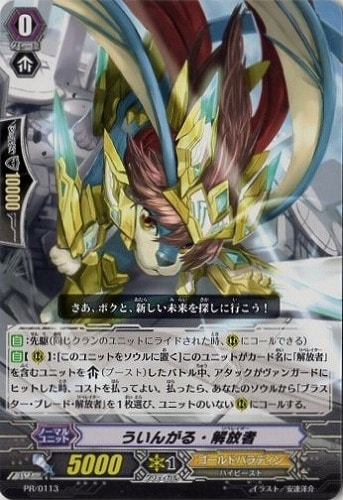 【自】:先駆(同じクランのユニットにライドされた時、(R)にコールできる)【自】【(R)】:[このユニットをソウルに置く]このユニットがカード名に「解放者」を含むユニットを【ブースト】したバトル中、アタックがヴァンガードにヒットした時、コストを払ってよい。払ったら、あなたのソウルから「ブラスター・ブレード・解放者」を1枚選び、ユニットのいない(R)にコールする。