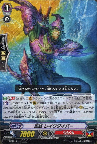 【自】【Gブレイク】(1)(あなたの(V)かGゾーンに表のGユニットが1枚以上で有効):[【カウンターブラスト】(1)]このユニットが(R)に登場した時、コストを払ってよい。払ったら、あなたの山札から「忍妖 レイクダイバー」を2枚まで探し、別々の(R)にコールし、その山札をシャッフルし、そのターンの終了時、この効果でコールされたユニットを山札の下に好きな順番で置く。