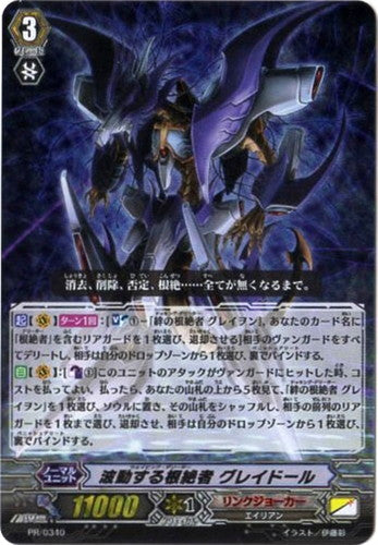 【起】【(V)】【ターン1回】:[【ソウルブラスト】(1)-「絆の根絶者 グレイヲン」,あなたのカード名に「根絶者」を含むリアガードを1枚選び、退却させる]相手のヴァンガードをすべてデリートし、相手は自分のドロップゾーンから1枚選び、裏でバインド(バニッシュデリート)する。【自】【(V)】:[【カウンターブラスト】(1)]このユニットのアタックがヴァンガードにヒットした時、コストを払ってよい。払ったら、あなたの山札の上から5枚見て、「絆の根絶者 グレイヲン」を1枚選び、ソウルに置き、その山札をシャッフルし、相手の前列のリアガードを1枚まで選び、退却させ、相手は自分のドロップゾーンから1枚選び、裏でバインド(バニッシュデリート)する。