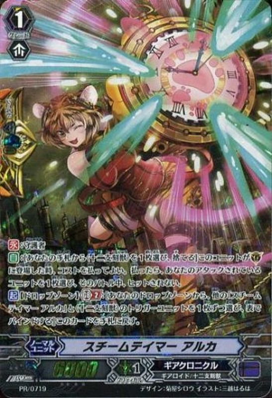 【永】:守護者【自】:[あなたの手札から〈十二支刻獣〉を1枚選び、捨てる]このユニットが(G)に登場した時、コストを払ってよい。払ったら、あなたのアタックされているユニットを1枚選び、そのバトル中、ヒットされない。【起】【ドロップゾーン】【Gブレイク】(2):[あなたのドロップゾーンから、他の「スチームテイマー アルカ」と〈十二支刻獣〉のトリガーユニットを1枚ずつ選び、表でバインドする]このカードを手札に戻す。